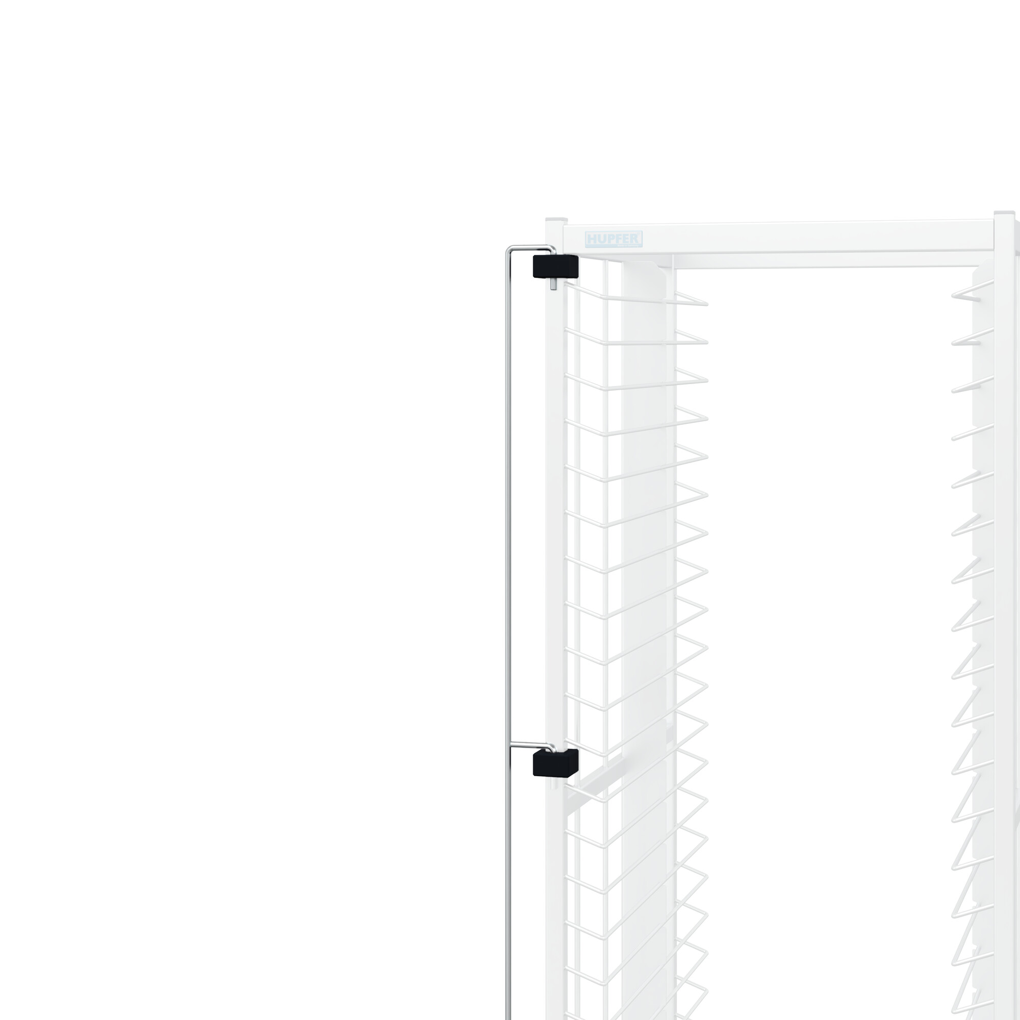 Durchgehender Vollmaterialbügel in stabiler und hygienischer Konstruktion aus hochwertigem Edelstahldraht mit Führungen aus Polyethylen zur Sicherung der Kühlplatten im Fahrbetrieb.