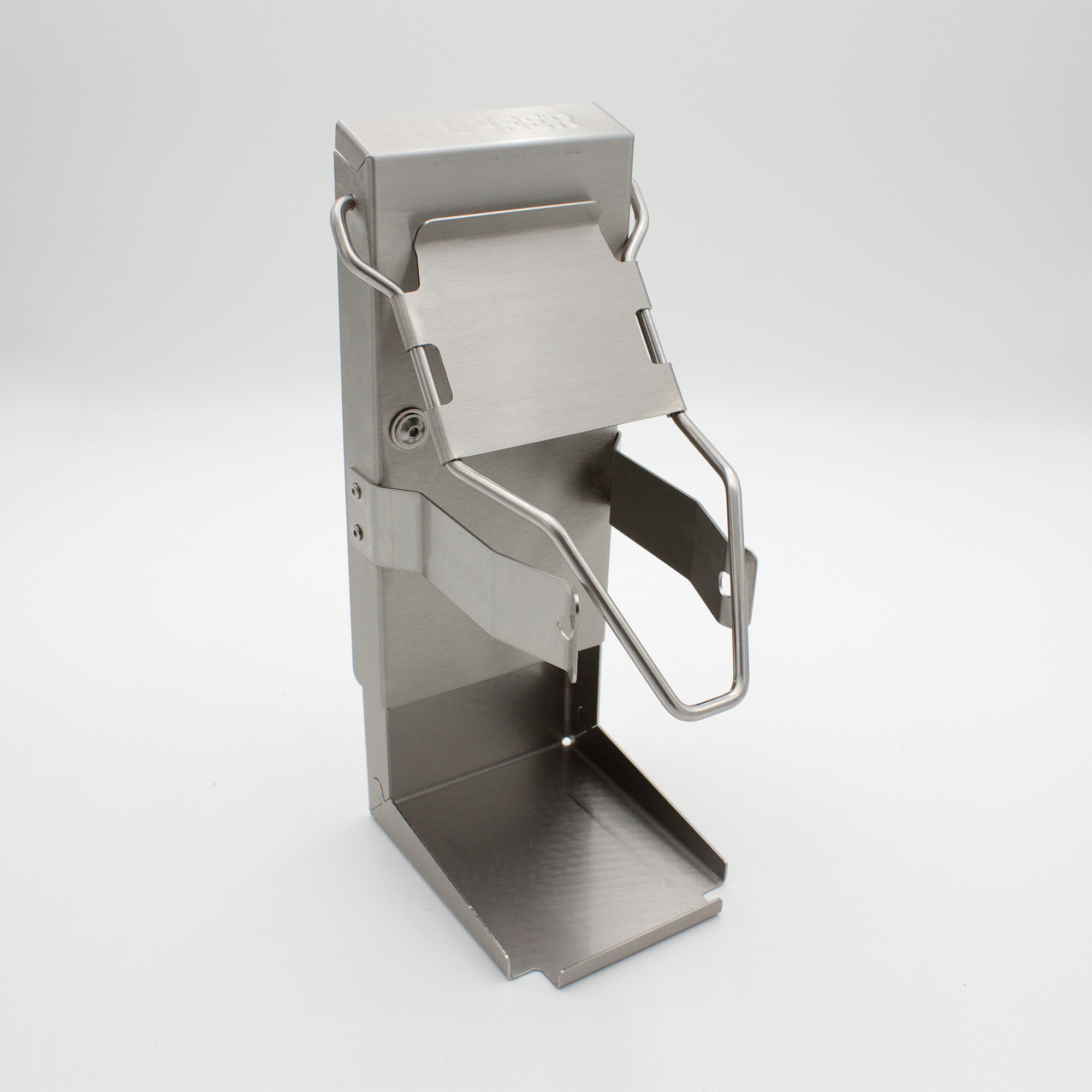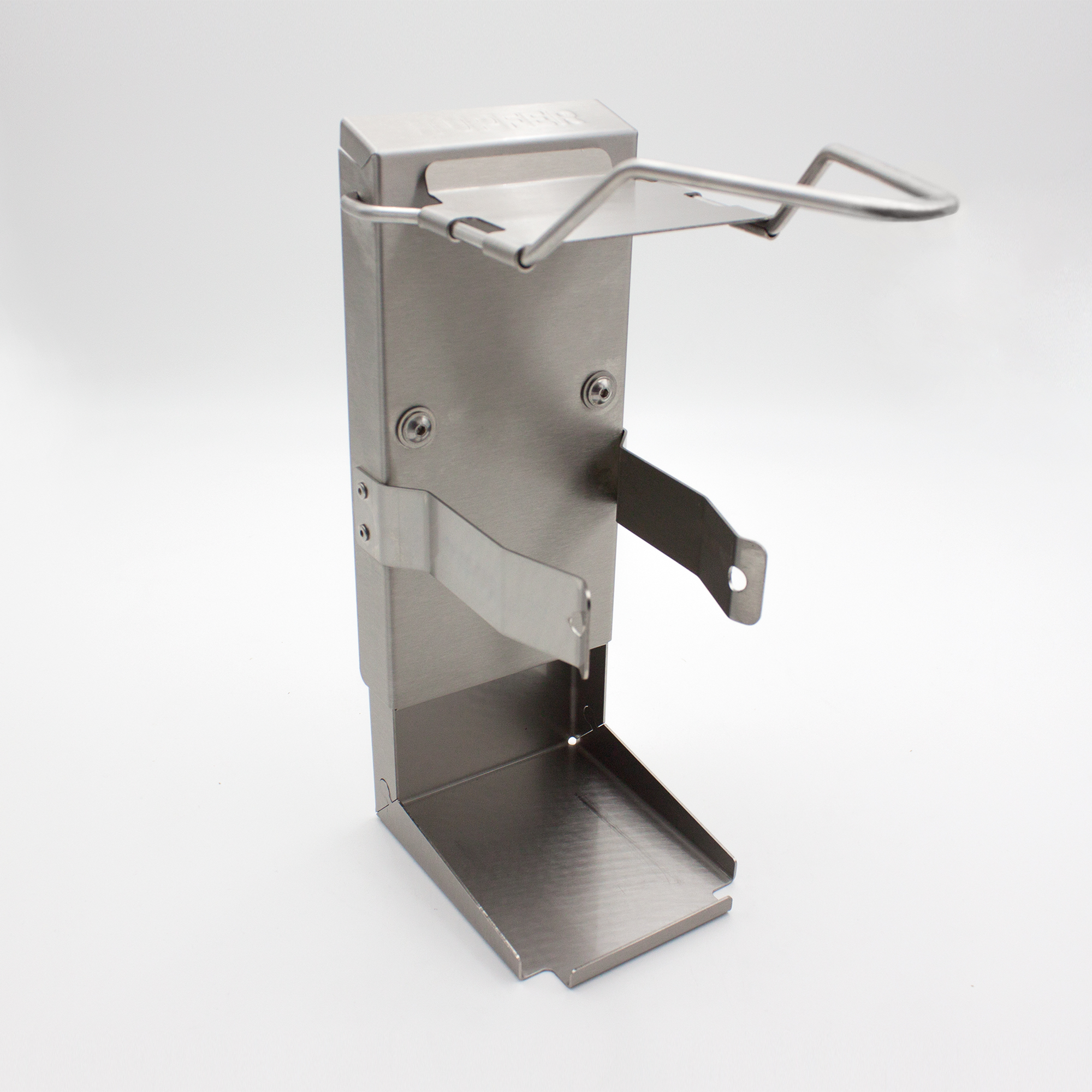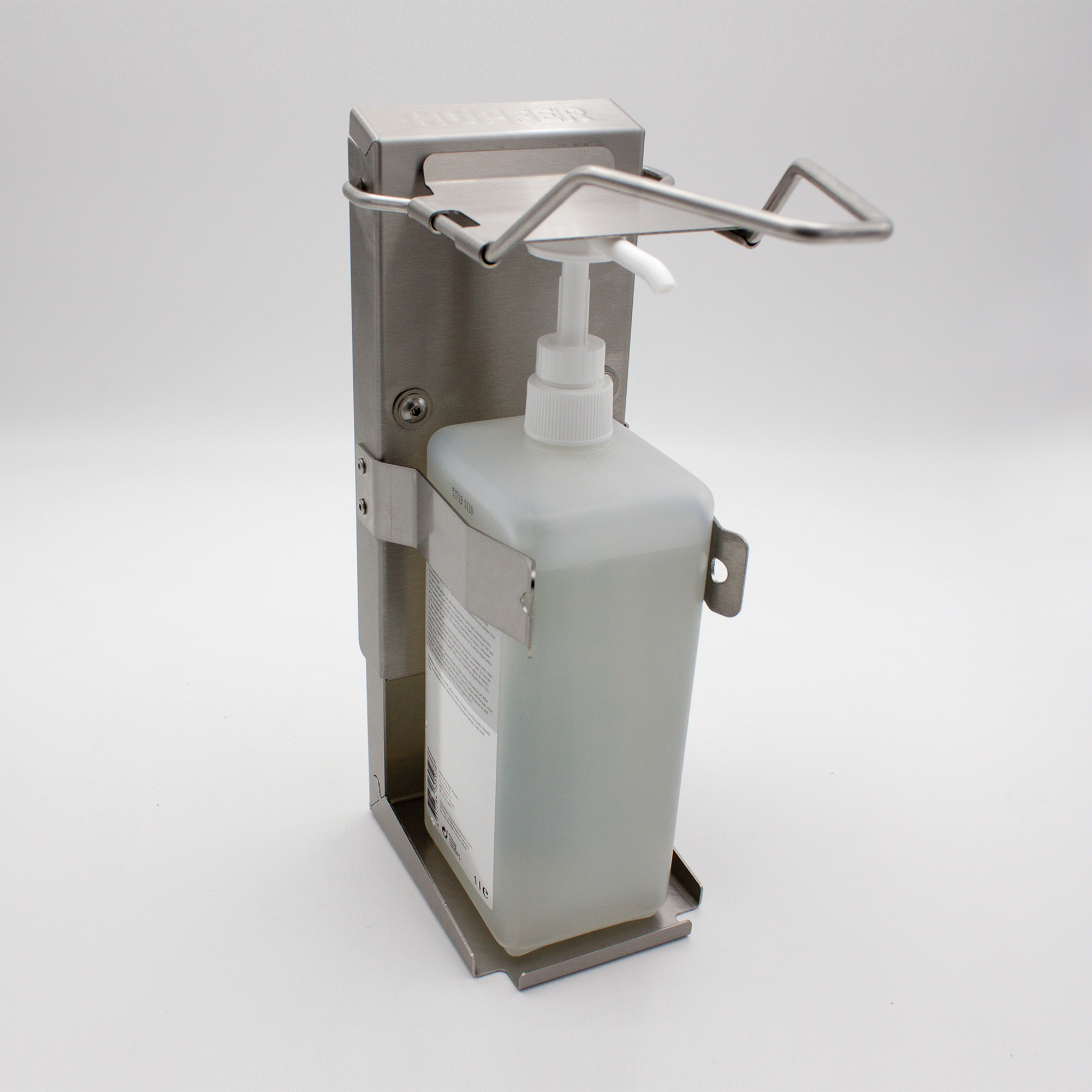 Soap and disinfectant dispenser made from high-quality stainless steel in a hygienic design for wall mounting, universally applicable for bottles with a pump device in standard shapes and sizes.
