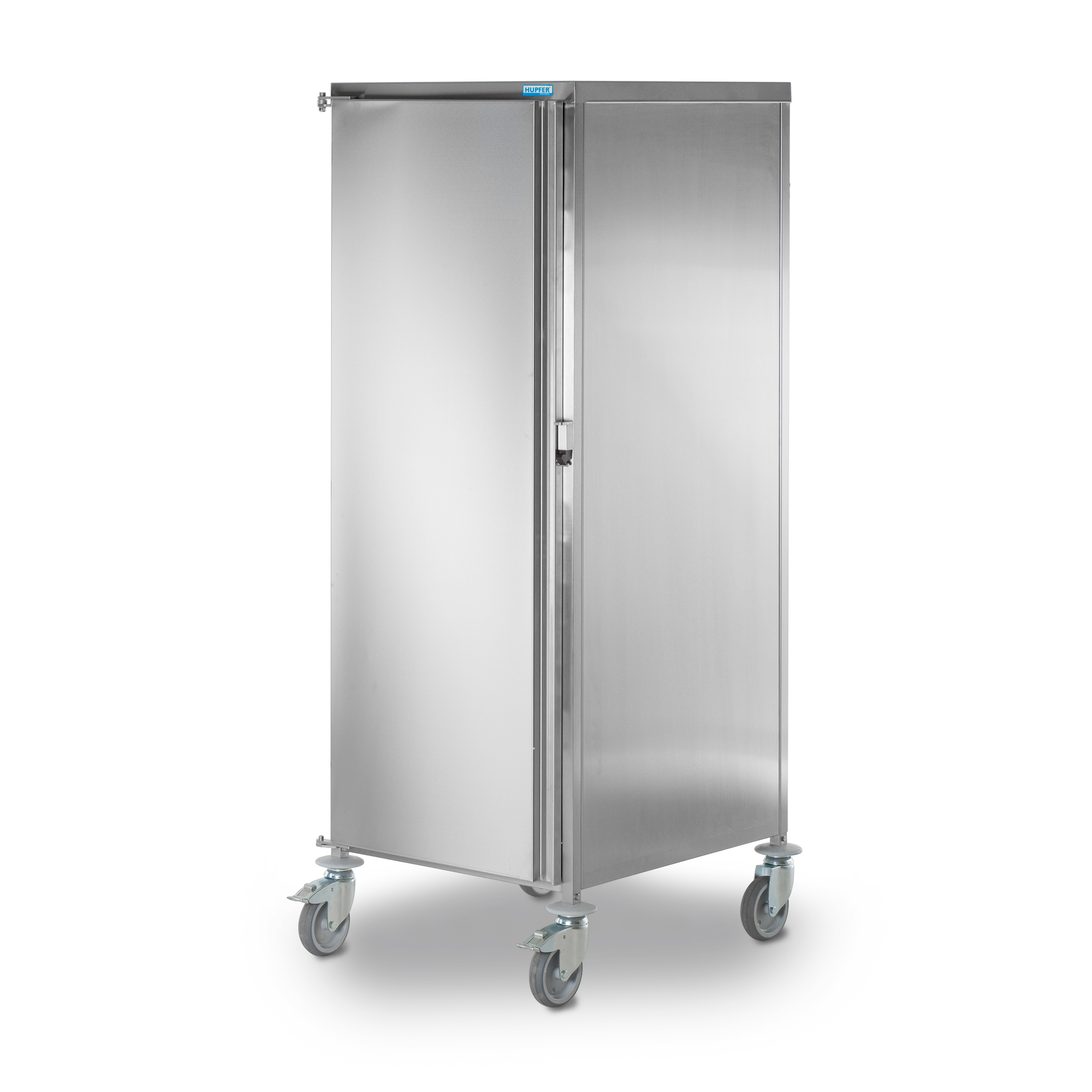 Trolley with one compartment in robust, self-supporting and hygienic design, made of high-quality stainless steel square tubes, with panellings on all sides and a double-wing door. Welded U-shaped shelf rails with push-through and tilt protections on both sides as per DIN EN 18867-2. In addition to the vertical square tubes, 2 rectangular-profile cross braces ensure user-friendly handling. 4 polyethylene disc bumpers serve as bumpers and protect trolley on all sides as well as building-side walls from being damaged. Trolley runs on 4 swivel casters of which 2 with total locks, ø 4.9'' (125 mm), with pin fastening.