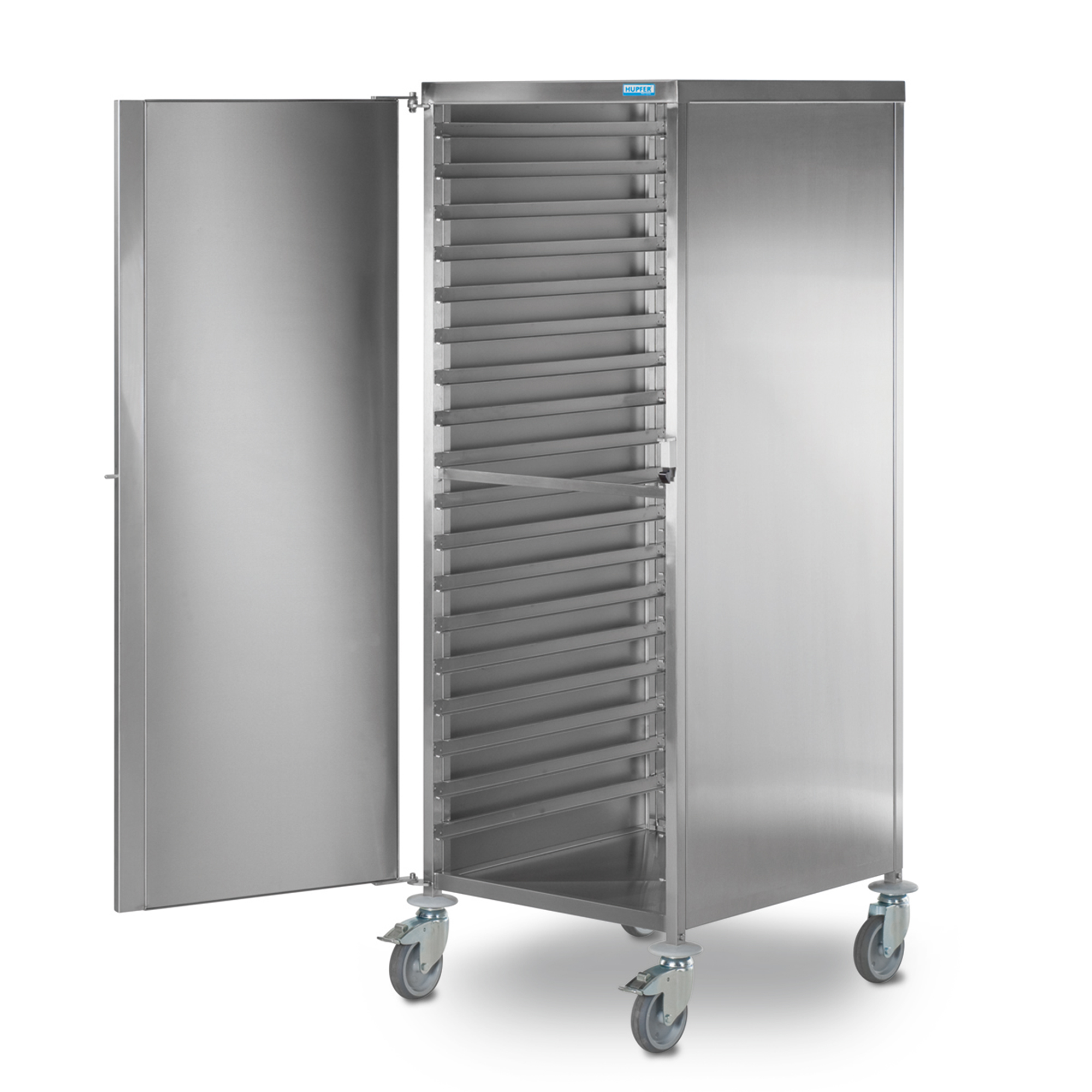 The Hupfer gastronorm trolley RWG / Z 1 / 36 GN 75-B-U is the only shelf trolley to be completely enclosed as series standard, and features a rail spacing of 75 mm, which gives it a 50 % greater capacity (when GN containers without lids with a depth of 150 mm are placed in it) in comparison to other products.