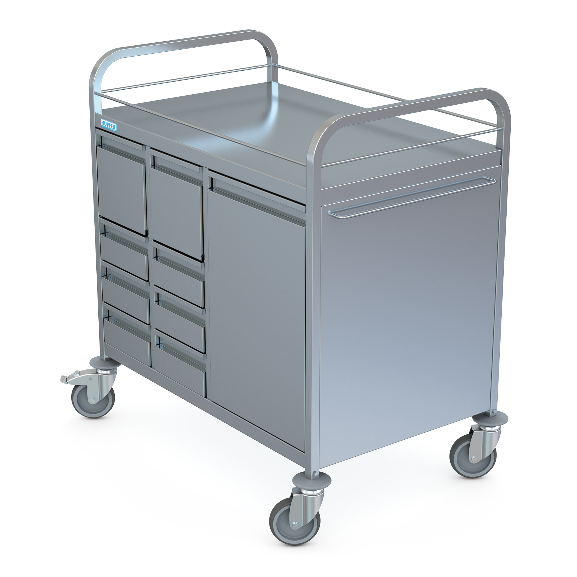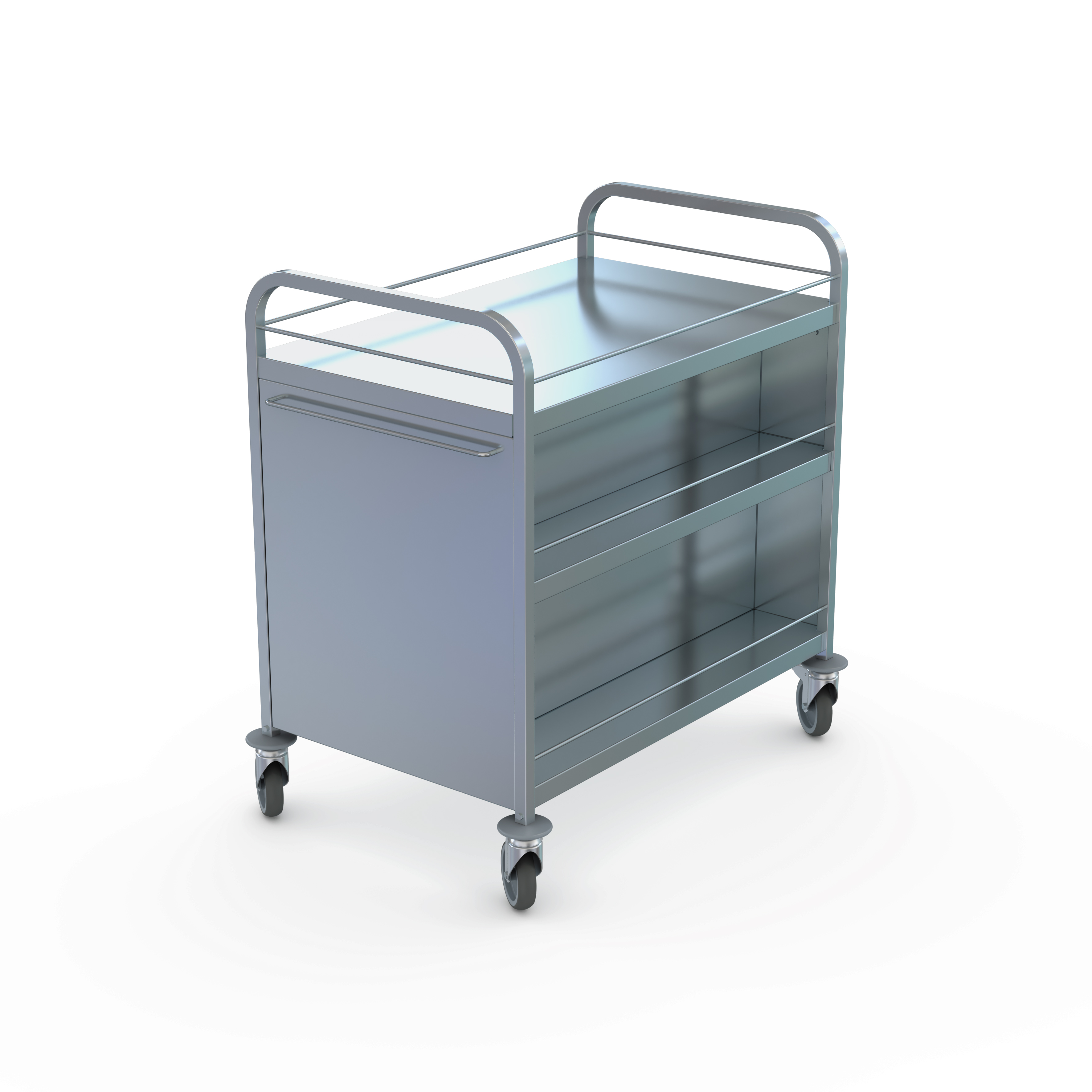 Trolley in robust, self-supporting and hygienic design, made of high-quality stainless steel. Square tube frame with a welded, even shelf, hygienically folded, in easy-to-clean design. One long side with hinged compartments with stainless steel casing, drawers and two-level menage drawer with full-extension runner for storing bottles and spice jars, secured by wire galleries. Opposite long side with two deep-drawn storage compartments with profile edge. Short-side wires for attaching kitchen tools. Push bars integrated on both sides into tube frame ensure good manoeuvrability. 4 polyethylene disc bumpers serve as bumpers and protect trolley on all sides as well as building-side walls from being damaged. Trolley runs on 4 swivel casters of which 2 with total locks, ø 4.9'' (125 mm), with pin fastening.