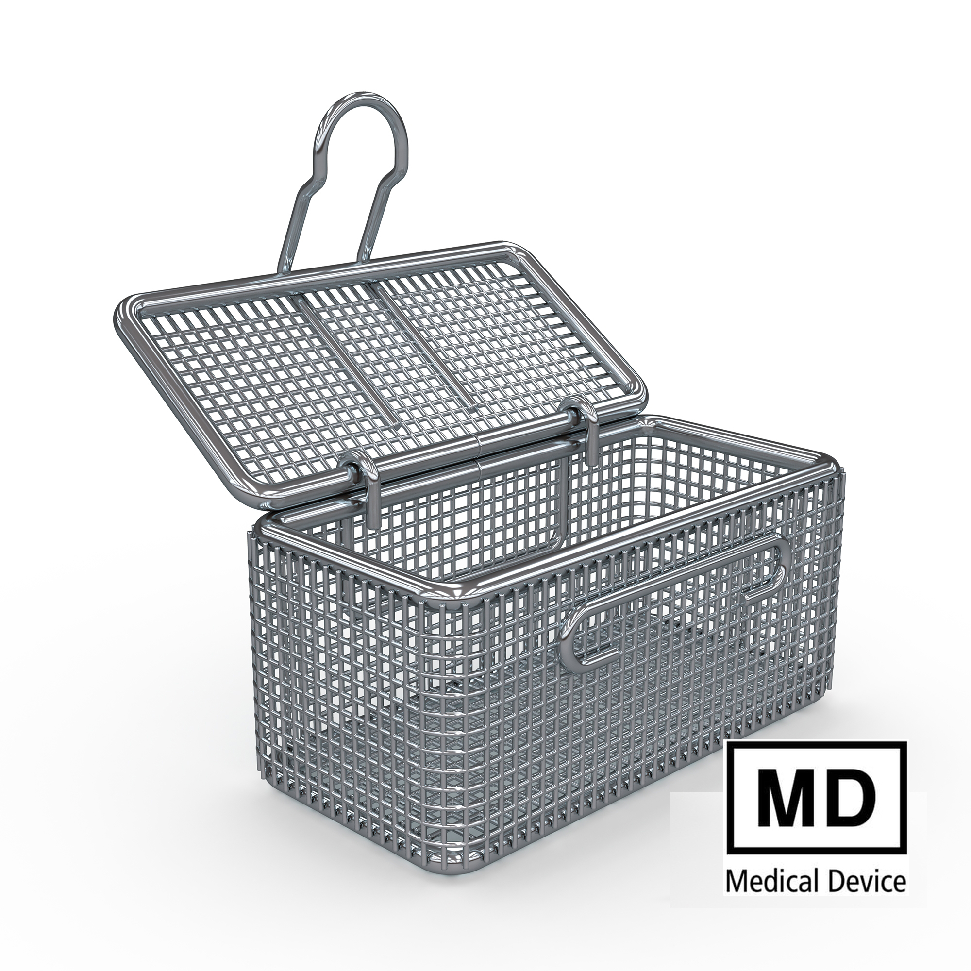Rinsing basket with fixed lid, made of high-quality stainless steel wire for storing small parts and accessories during the cleaning process.