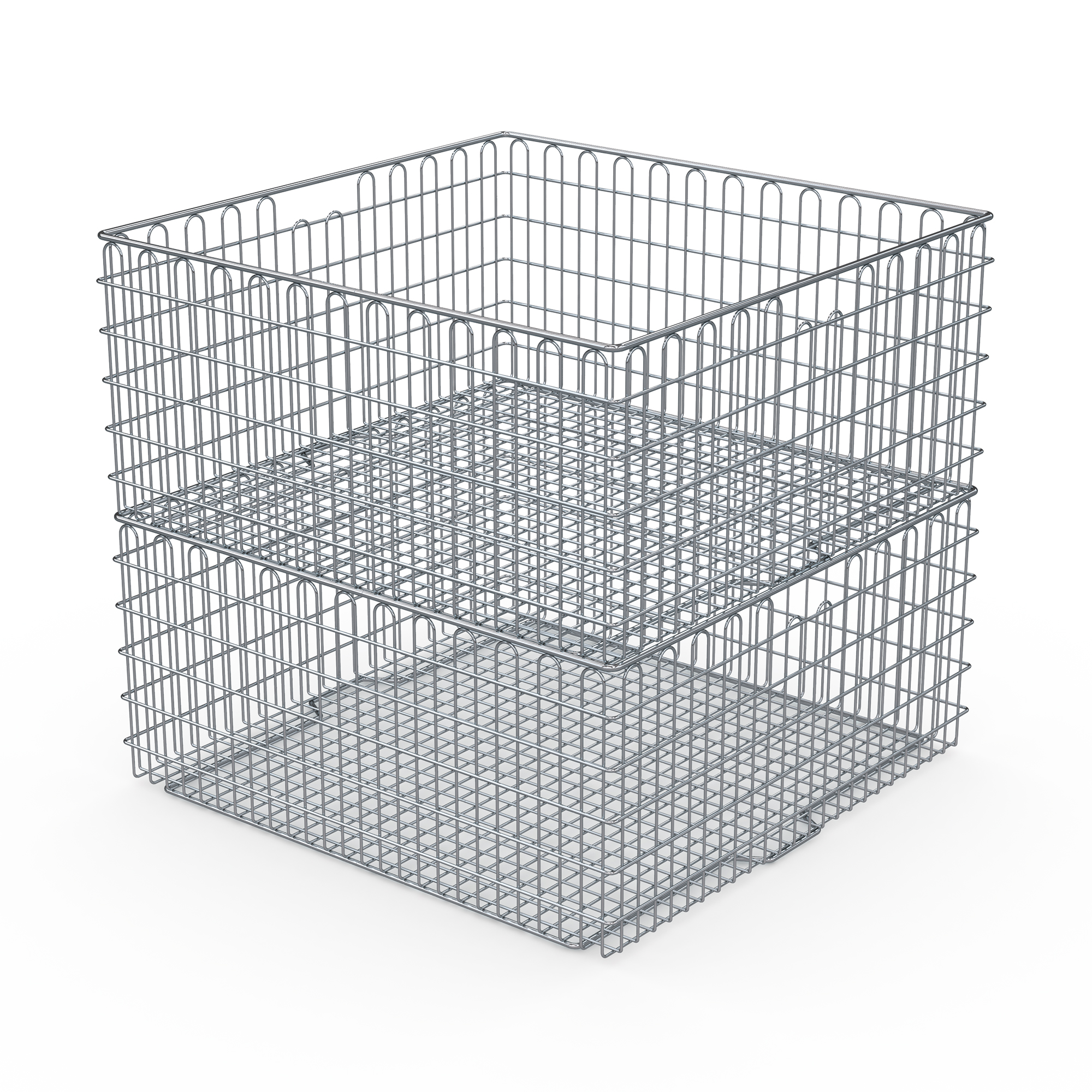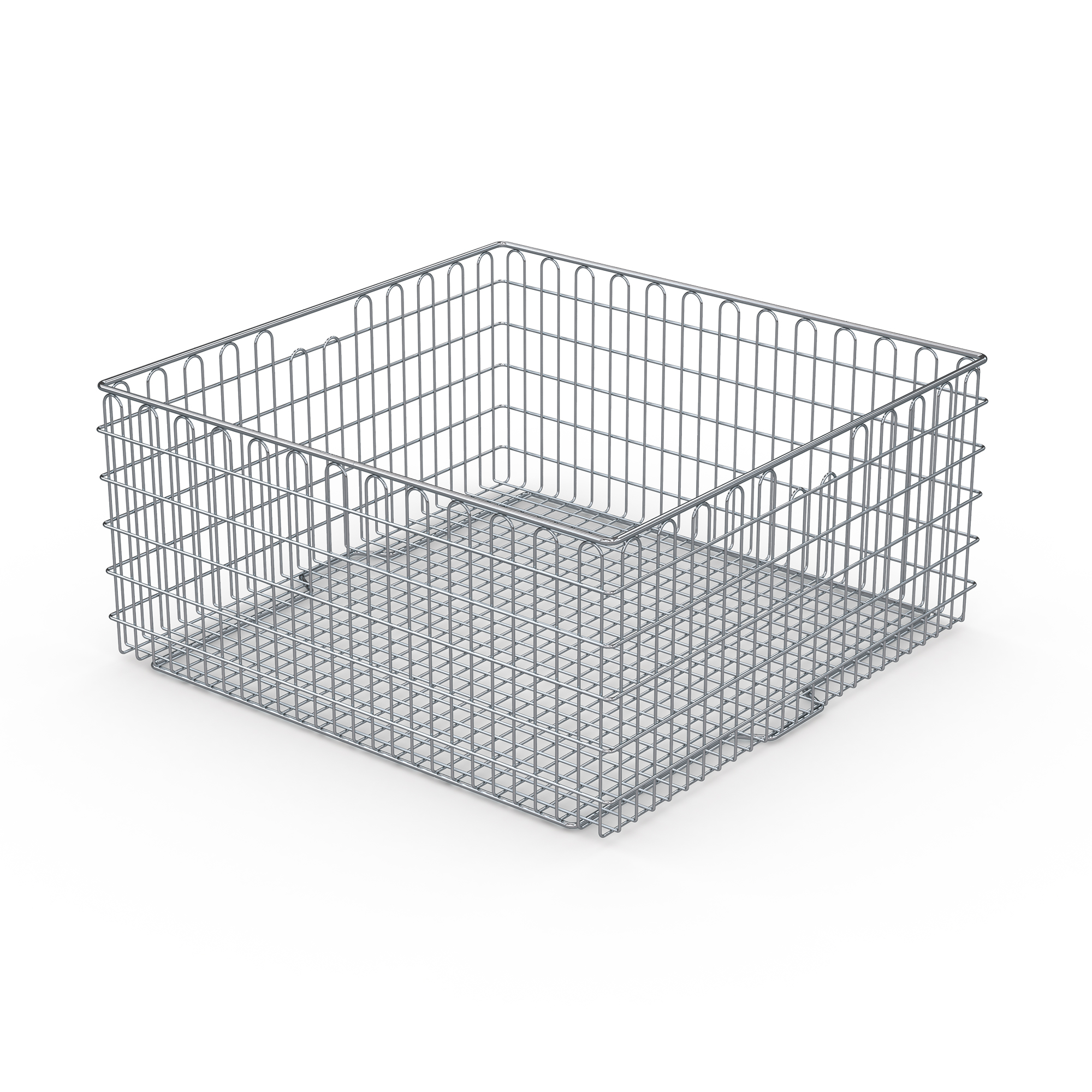 Basket in sterilisable version suitable for washing devices, made of high-quality, electro-polished stainless steel round material and comprising closed wire loops in base and walls. Sterile supplies basket for attaching to wall hook racks or hook trolleys. Special shape of base frame allows stacking of baskets onto one another. Easy handling thanks to frontal carrier handle openings.