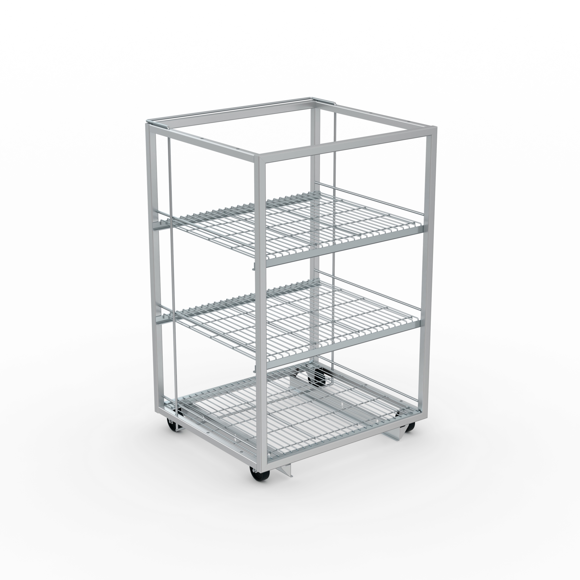 Rack in robust, self-supporting, hygienic and sterilisable design, made of high-quality stainless steel square tubes with two welded wire shelves and one wire shelf that can be hooked in loosely in the lower section. Safe connection of rack and receiving system component (transport trolley, transfer dolly or base frame) by means of a locking wire that is released by lifting at the upper side of the rack. Once the rack has been retracted until it has reached the locking point and the wire is let loose, the wire latches safely and audibly into an anchor block. Two guide rails, made of stainless steel sheet and arranged centrally in longitudinal direction underneath the rack, provide additional safety along with matching guide rollers at the relevant system component. Mobile rack frame runs on 4 sterilisable fixed casters with ø 3.0" (75 mm) caster body made of polymer.