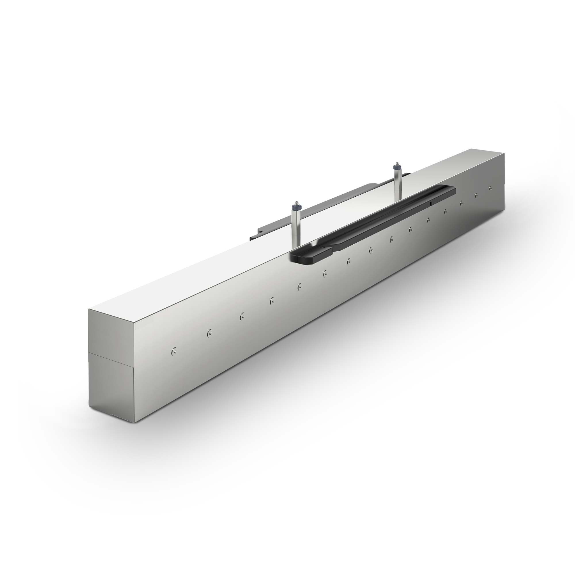 Transfer threshold as part of the KÄNGURUH-SYSTEM® and hygienic transfer point between the clean and unclean sections.Threshold in robust, self-supporting and hygienic design, made of high-quality stainless steel. Transfer threshold designed for easy cleaning, for coupling-up transport trolleys with two-point locking. Threshold consisting of a lower part with holes for safe screwing to the building-side floor and an upper part that is slipped over and suitable for compensating floor unevennesses thanks to its continuously variable height. Plastic docking strips on both sides for safe docking of a transfer dolly on the clean and of a closed transport trolley on the unclean side. Undocking of the transfer dolly using a manual release on the trolley and of the closed transport trolley by means of an integrated foot pedal on the threshold.
