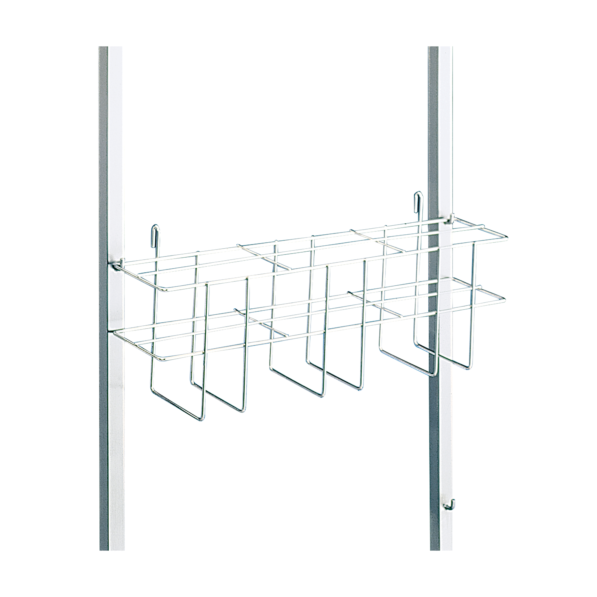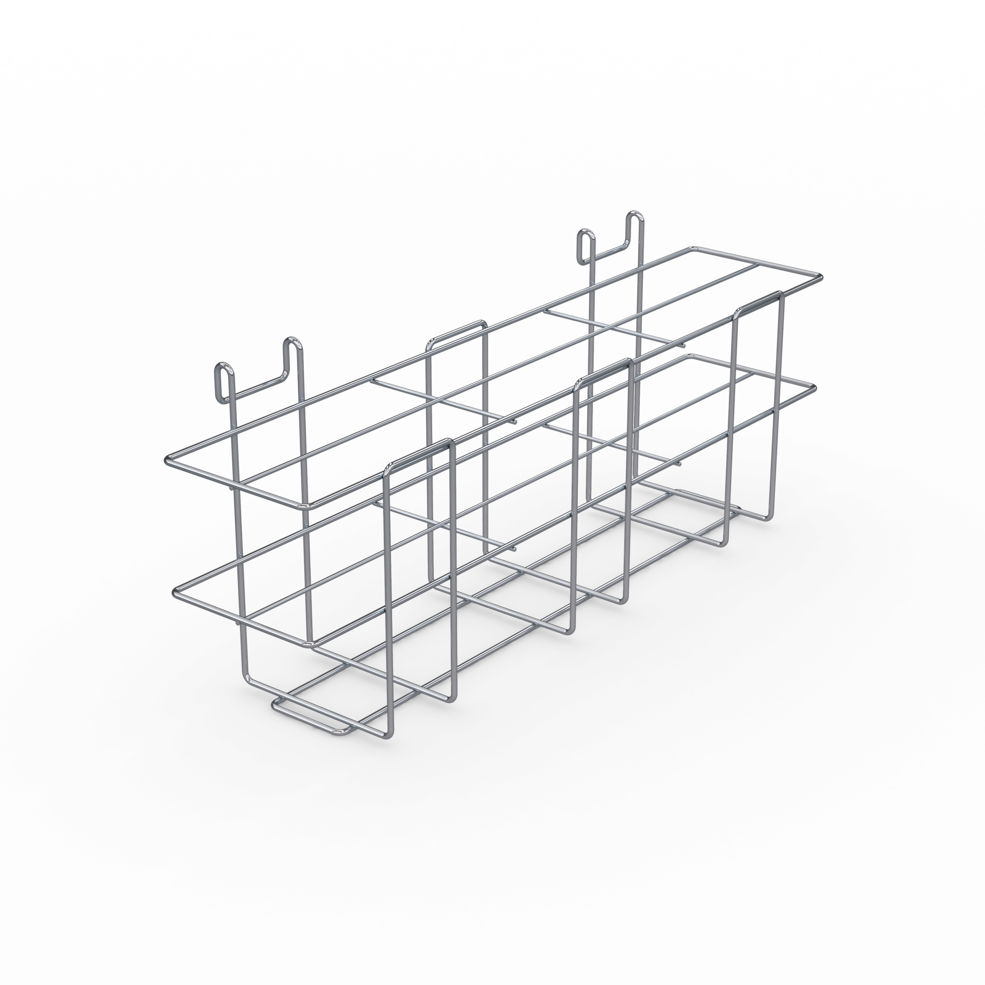 Robust, self-supporting and hygienic design, completely made of high-quality, electro-polished and burr-free stainless steel wire. Stainless steel wire basket with subdivision into six compartments. Two suspension brackets for attaching the basket to wall hook racks, hook trolleys or at the long side of a sterile supplies basket.