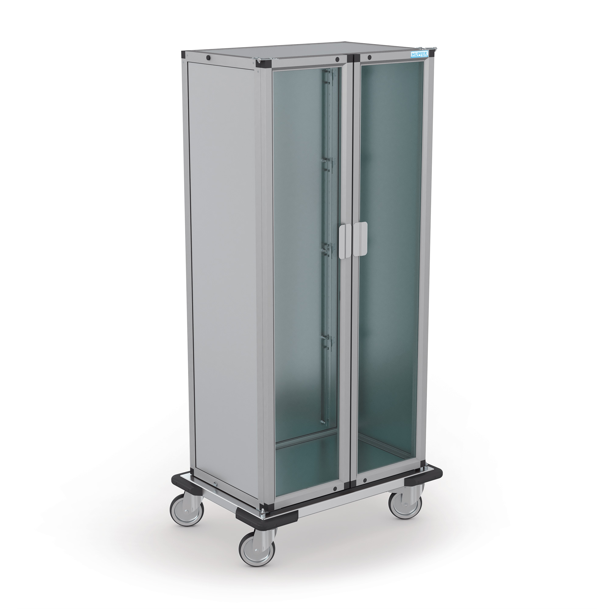 Carro con ganchos cerrado para el transporte y almacenamiento protegidos del polvo de soportes para material de sutura, dispensadores de guantes y otros artículos adecuados para colgar en listones de ganchos.